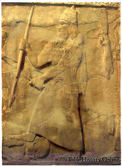 In this wall relief the Assyrian king places his foot upon the neck of his enemy to symbolize complete submission and defeat of the captured king.