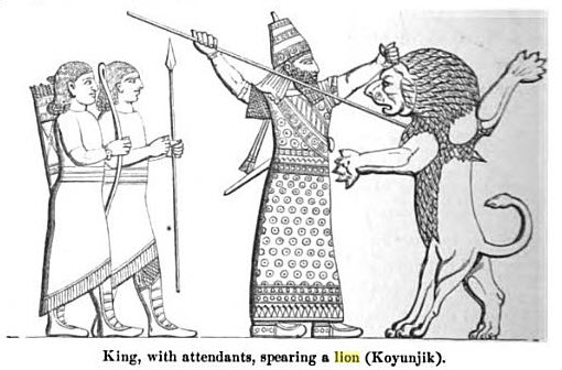 The favourite occupation of the king in peace was the chase of the lion. In the early times he usually started on a hunting expedition in his chariot, dressed as when he went out to war, and attended by his charioteer, some swordsmen, and a groom holding a led horse. He carried a bow and arrows, a sword, one or two daggers, and a spear, which last stood in a rest made for it at the back of the chariot.8 Two quivers, each containing an axe and an abundant supply of arrows, hung from the chariot transversely across its right side, while a shield armed with teeth was suspended behind. When a lion was found, the king pursued it in his chariot, letting fly his arrows as he went, and especially seeking to pierce the animal about the heart and head. Sometimes he transfixed the beast with three or four shafts before it succumbed. Occasionally the lion attacked him in his chariot, and was met with spear and shield,' or with a fresh arrow, according to the exigencies of the moment, or the monarch's preference for one or the other weapon. On rare occasions the monarch descended to the ground, and fought afoot He would then engage the lion in close combat with no other weapon but a short sword, which he strove to plunge, and often plunged, into its heart. - Rawlinson