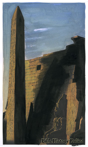 This painting is of an ancient Egyptian Obelisk which was discovered standing at the place known as the Horizon of the sun god Re. Rameses II built this as the primary entrance to his temple at Luxor in Thebes. The obelisk describes his achievements, it stands 82 feet tall and weighs about 250 tons. The top was capped with a pyramidion which flashed first with the early morning rays of the sun. Obelisks were considered idols of jealousy in the Bible and were cursed by God. This Ancient Egyptian Obelisk confirms the Bible and is important in the study of Biblical Archaeology.