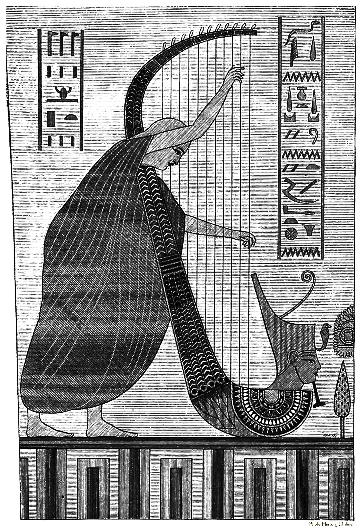 An illustration of an Egyptian harpist robed in a long black mantle and with a richly ornamented harp.