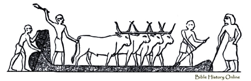 Threshing was sometimes done by instrument and sometimes by having the grain trampled upon by horses or oxen.