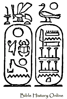 Illustration of the cartouches of Shishak. A cartouche is an oblong enclosure with a horizontal line at one end, indicating that the text enclosed is a royal name