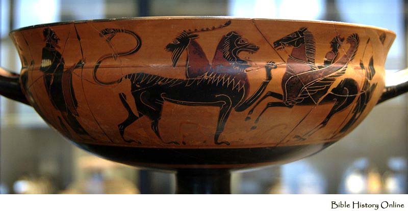 Bellerphon fighting chimera, side A of an attic black figured Siana cup, 575-550 BC.