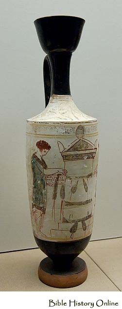 Detail from an attic white ground lekythos of a woman decking a gravestone garlands.