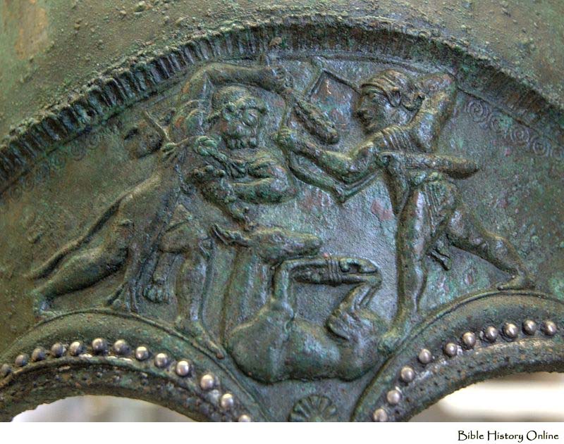 Heracles and Apollo dispute on the Cerynian hind, detail from a bronze Corinthian helmet.