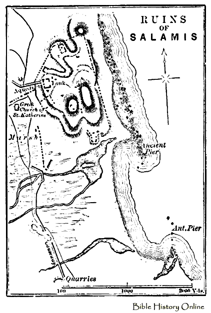 Map showing the ruins of Salamis, a city at the east end of the island of Cyprus.