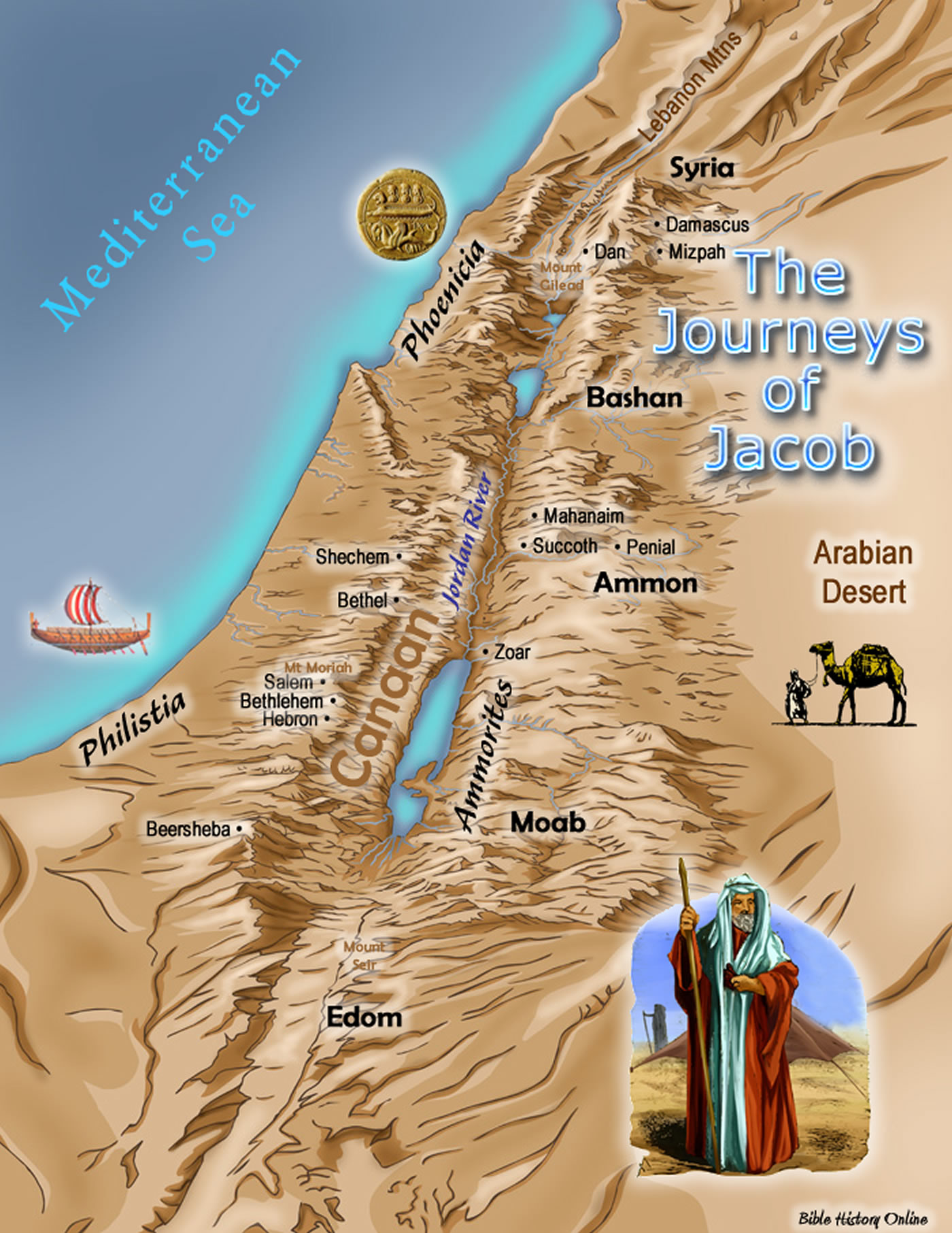Map of the Journeys of Jacob, the Father of the 12 Tribes of Israel