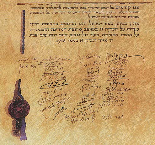 PLACING OUR TRUST IN THE ALMIGHTY, WE AFFIX OUR SIGNATURES TO THIS PROCLAMATION AT THIS SESSION OF THE PROVISIONAL COUNCIL OF STATE, ON THE SOIL OF THE HOMELAND, IN THE CITY OF TEL-AVIV, ON THIS SABBATH EVE, THE 5TH DAY OF IYAR, 5708 (14TH MAY,1948)."