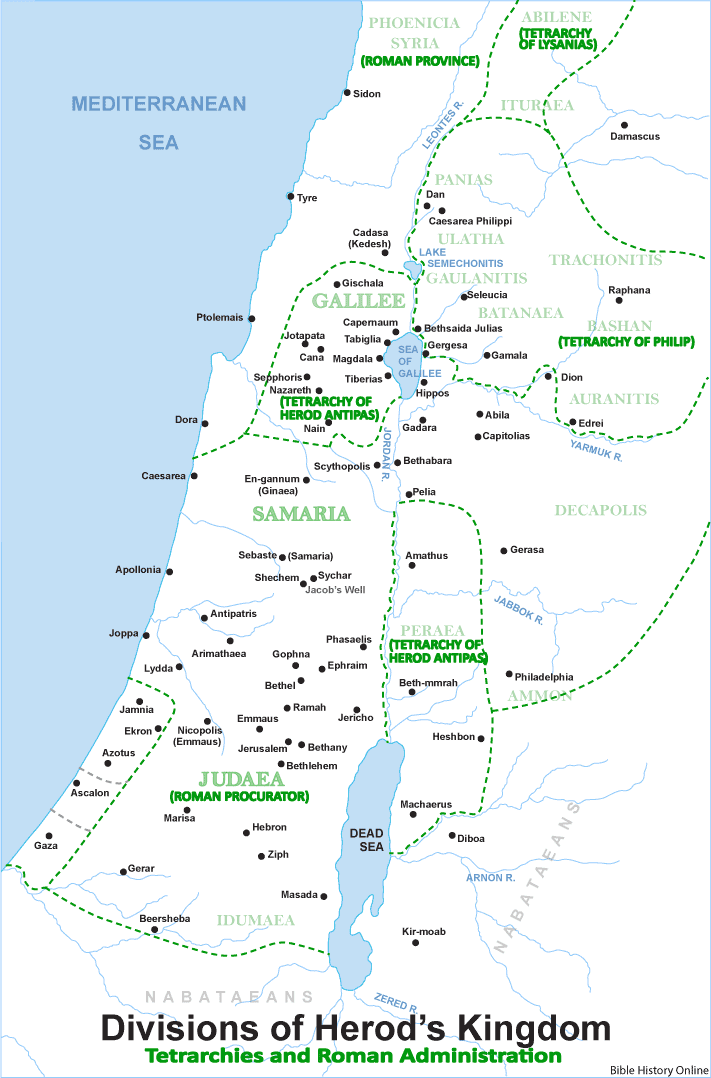 After Herod the Great had died his kingdom was divided among his three sons, Antipas, Phillip, and Archelaus. Archelaus inherited Judea, Antipas was given Galilee and Perea (Transjordan), and Phillip inherited the predominantly Gentile areas east and north of the Sea of Galilee. Caesar Augustus quickly removed Archelaus after there were so many bad reports about him from the Jews. Read More about Herod's Sons.