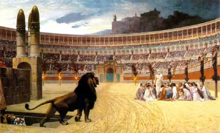 This painting reveals the horror of Christian persecution during the times of the Roman Empire. Lions and other wild animals would tear the Christians apart limb from limb, entertainment for the crowd.