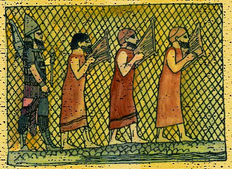 This sketch is from an actual discovery in the ruins of ancient Assyria, and shows Jewish prisoners being led away through a thick forest in the mountains. The Assyrian soldier is carrying a club, with bow and arrows. Notice the Hebrews have long tunics with bare feet, and one of them has his head uncovered. The distinct Jewish features are the peculiar haircut and short, thick beards. The Bible reveals that the Jews were compelled to play the Lyre as they were carried away. Notice also the Assyrians boots. The boots are reminiscent of the words of the Hebrew prophet Isaiah, 'the stamping warriors boot' relating to the ultimate destruction of all who would come against God's people (Isaiah 9:5). Notice what it says about horses and chariots of the Assyrians: Jeremiah 47:3 - At the noise of the stamping of the hoofs of his strong [horses], at the rushing of his chariots, [and at] the rumbling of his wheels, the fathers shall not look back to [their] children for feebleness of hands;
